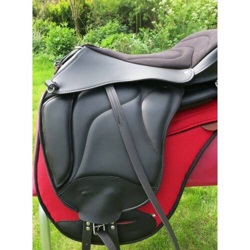 Torino, een veelzijdig zadel dat wat neigt naar dressuur. De kniewrong is geïntegreerd in het zweetblad en binnen deze ruimte verplaatsbaar, hij kan dus iets omhoog en omlaag gezet op wens van de ruiter. Ze kosten €1125,- en als Flexx variant €945,-
