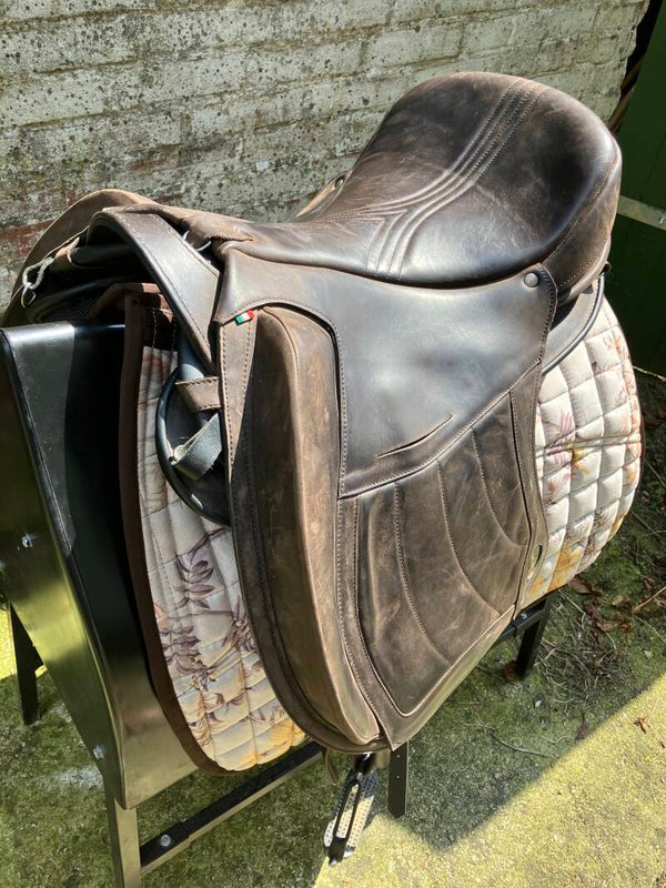 Ghost Trentino normale maat, zeer compleet. Italy kussens. Incl beugels en beugelriemen en 2 pads. Het zadel is pas 8 maanden oud. Geheel uitgevoerd in donkerbruin vetleer, cantle en bovenkant kussens zijn meegekleurd. Bij de pads zitten alle originele inlages en shims en verzorgingssetje. Nieuw is deze set met al deze toebehoren ruim €1500,-.