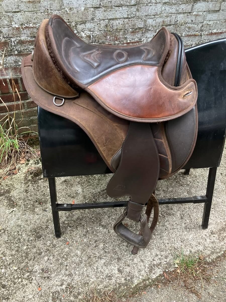 FRA Courville met fenders, maat M. Ouder zadel, maar niet versleten. Kleurloze pommel vergelijkbaar met maat M, losse pommels bij te leveren. Zonder pad, pad is ook los erbij te leveren.