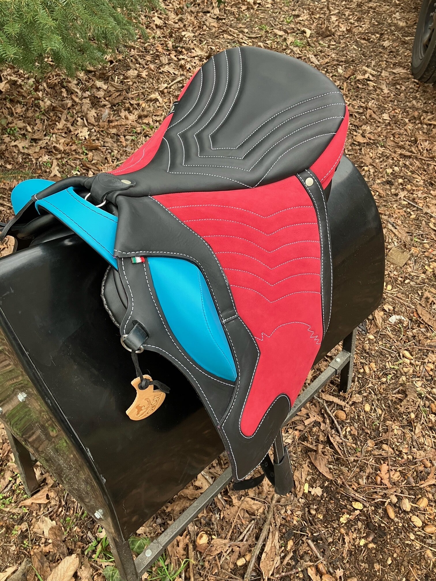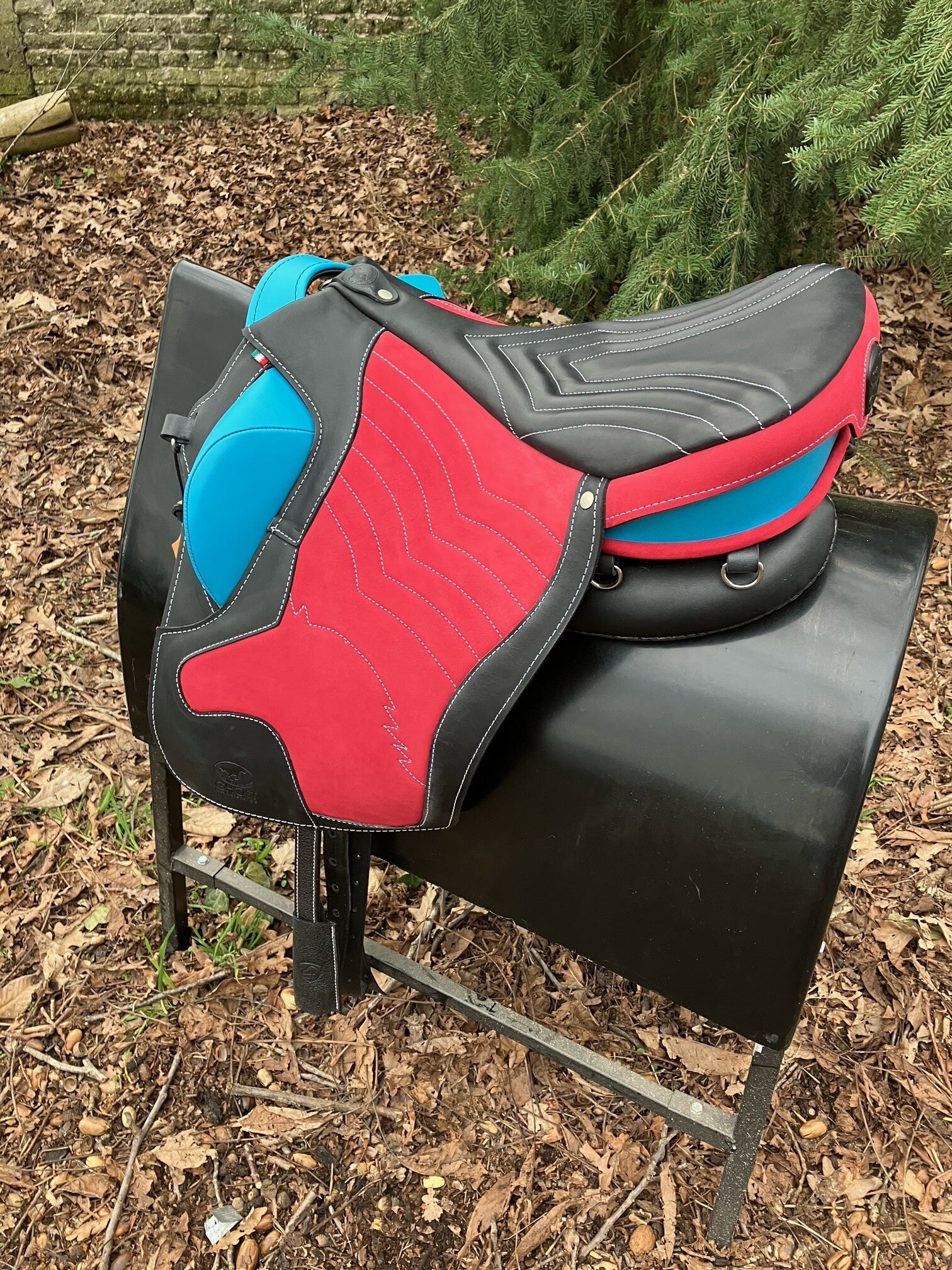 Ghost zadel maat piccolo, model Barocco met Roma wrongen. In deze uitvoering met paardenhoofd op het zweetblad Palio genoemd.
