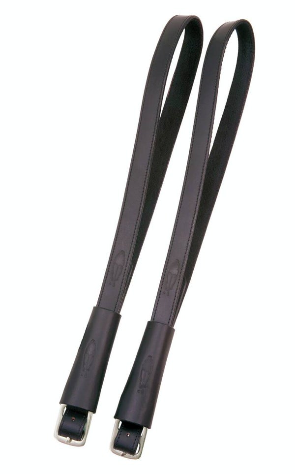 Beugelriemen van duurzaam glad leder. Met nylon versterkt tegen uitrekken. De gespen worden onderaan gebruikt, tegen de stijgbeugel aan, om drukplekken onder je dijbenen en op het zadel te voorkomen. Levering compleet met beugelriemhoesjes voor het netjes vastzetten en wegwerken van de uiteindes van de riemen.
